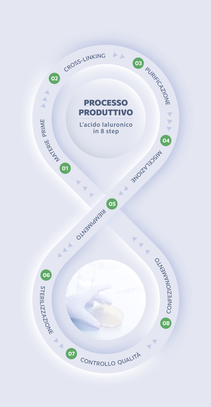 Per la produzione di dispositivi medici conto terzi a base di Acido Ialuronico, l’azienda utilizza materie prime di eccellente qualità e si avvale di un processo produttivo ecosostenibile, ad alta innovazione tecnologica e completamente Made in Italy.