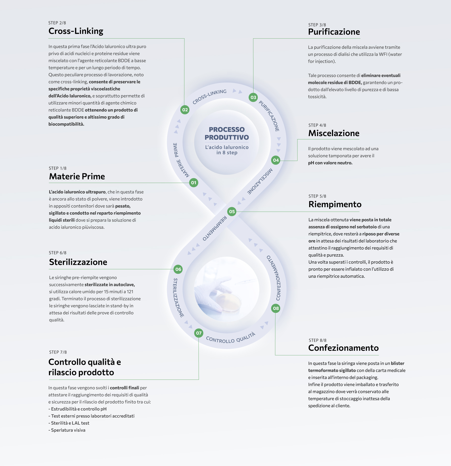 La purificazione della miscela avviene tramite un processo di dialisi che utilizza la WFI (water for injection). Tale processo consente di eliminare eventuali molecole residue di BDDE, garantendo un pro- dotto dall’elevato livello di purezza e di bassa tossicità.
